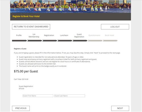 Next, if you’d like to add a guest, you may do so for $75. Guests may not attend educational sessions, but will be able to visit the Exhibit Hall and attend any Literature Luncheons for which you are registered.