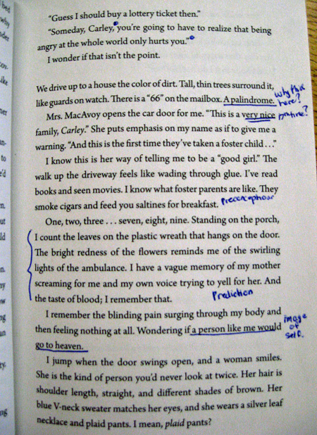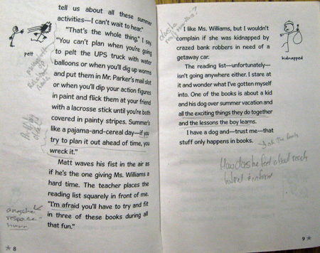 I leave these texts in the classroom library for readers. My fifth and sixth grade readers love the “thinking” found within the margins of gently loved books. They are attracted to these books because they feel comprehension is more accessible. One reader, while reading One for the Murphy's wrote down two phrases from the text and told everyone how and why they were important lines, something new to this 11-year-old reader. Upon conferring with the student, I realized that she borrowed the phrases I had already underlined, as her own. When asking her why the two lines were important, she identified the implicit humor in one line and “everlasting” idea in the second line. The scaffold worked. She now looks for phrases in her own reading.
